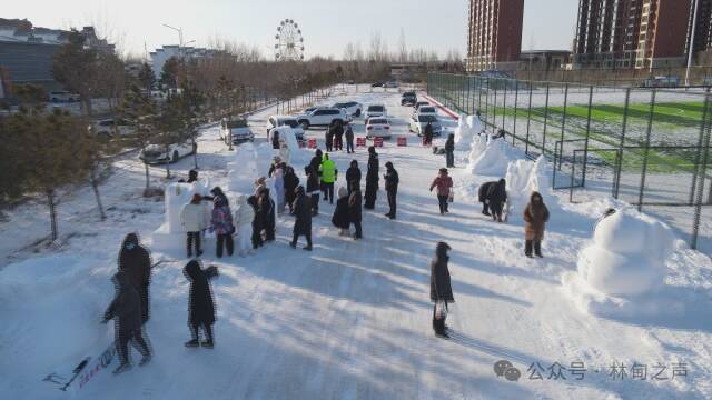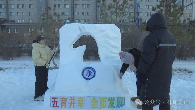 同时,巨型雪雕旁同步举办的“冰雪育魂 匠心筑梦”学生雪雕创意大赛,成为现场另一道亮眼风景线。来自全县中小学的20支参赛队伍,以“马年吉祥”“家乡新貌”“十五五畅想”为创作方向,在冰雪天地间展开创意角逐。同学们身着厚实的冬装,手持雪铲、模具等工具,分工协作、匠心雕琢,原本散落的雪堆在他们手中逐渐变成充满童趣与创意的作品。其中,林甸县第一中学团队创作的《祥马踏春护家乡》,将昂首的骏马与温泉、湿地等林甸元素相结合,既展现了马年的祥瑞之意,又表达了青少年对家乡的热爱;县第二中学团队的《逐梦“十五五”》则以奔跑的骏马承载着书本、齿轮等符号,寓意新一代少年以奋进姿态助力县域发展,作品构思巧妙、充满朝气,吸引了众多市民驻足点赞。